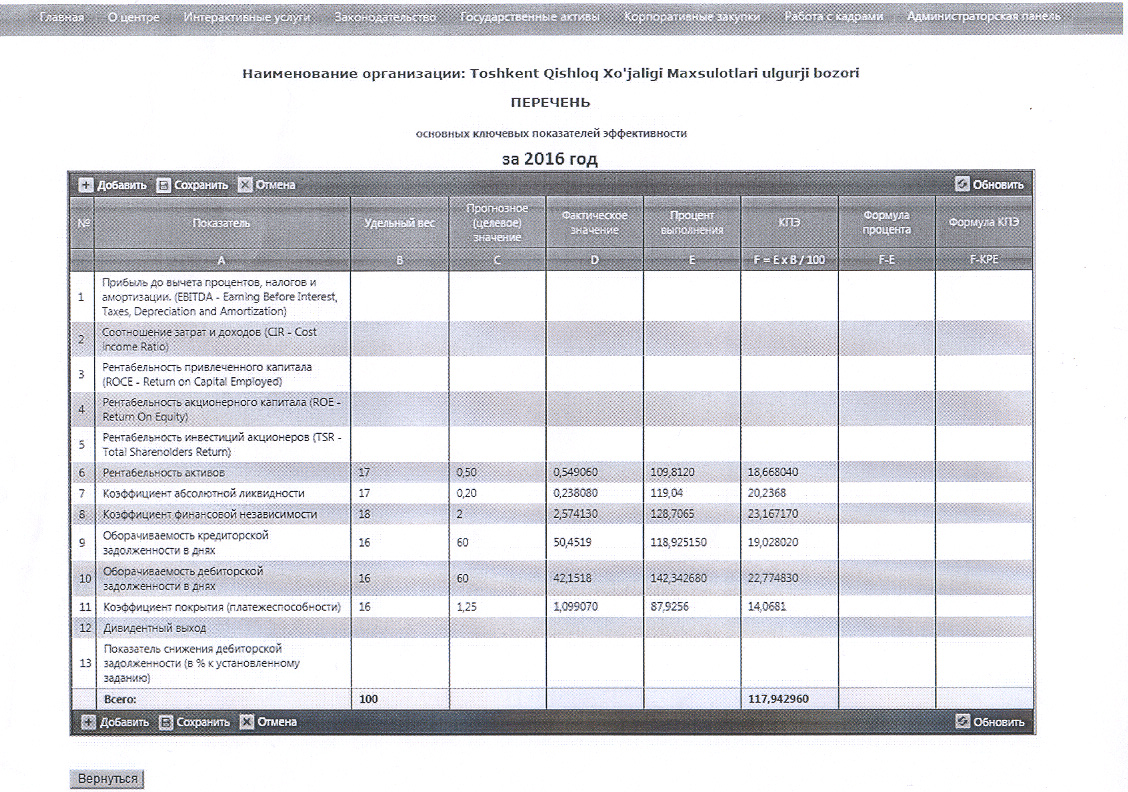 | 2016 йил буйича самарадорлик мезонлари кўрсаткичлари |